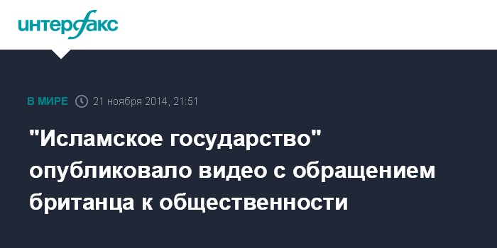 Москва. 21 ноября. INTERFAX.RU - Боевики из радикальной суннитской группировки "Исламское государство" разместили в интернете еще одну видеозапись обращения подданного Великобритании Джона Кэнтли, ранее захваченного экстремистами, сообщает в пятницу британский телеканал SkyNews.