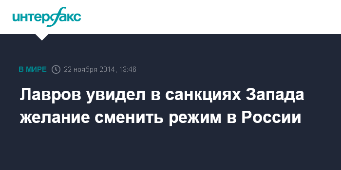 Москва. 22 ноября. INTERFAX.RU - Введенные против России санкции со стороны Запада нацелены не просто на изменение политики Москвы по тому или иному вопросу, а на смену режима, считает глава МИД РФ Сергей Лавров.