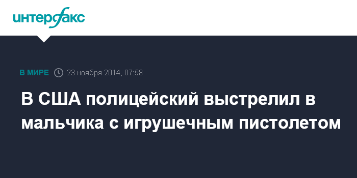 Москва. 23 ноября. INTERFAX.RU - В американском Кливленде (штат Огайо) полицейский выстрелил в 12-летнего мальчика, державшего в руках игрушечный пистолет, сообщило агентство Associated Press в субботу.