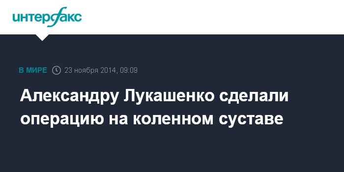 Москва. 23 ноября. INTERFAX.RU - Президенту Белоруссии Александру Лукашенко сделали операцию на коленном суставе, сообщила в эфире белорусского телеканала СТВ пресс-секретарь главы государства Наталья Эйсмонт.
