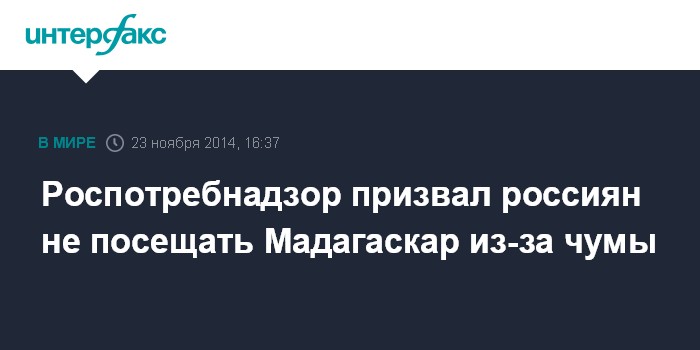 Москва. 23 ноября. INTERFAX.RU - Российским туристам рекомендовано воздержаться поездок на Мадагаскар, где зарегистрирована вспышка чумы, сообщает сайт Роспотребнадзора в воскресенье.