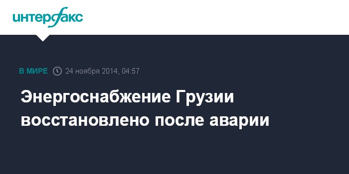 Москва. 24 ноября. INTERFAX.RU - В Гурзии полностью восстановлено энергоснабжение после аварии, произошедшей в ночь на понедельник. Об этом "Интерфаксу" сообщила руководитель службы по связям с общественностью компании "Государственная электросистема Грузии" Нино Джейранашвили