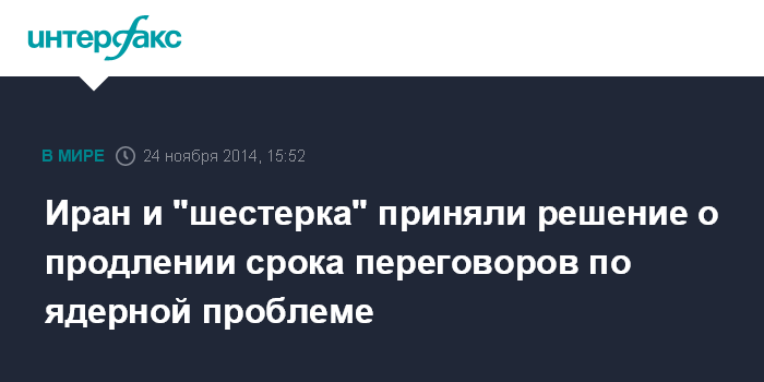 Москва. 24 ноября. INTERFAX.RU - Представители Тегерана и "шестерки" международных посредников в понедельник приняли решение продлить срок переговоров по ядерной проблеме, сообщает иранское агентство ISNA со ссылкой на близкий к делегации Ирана источник.