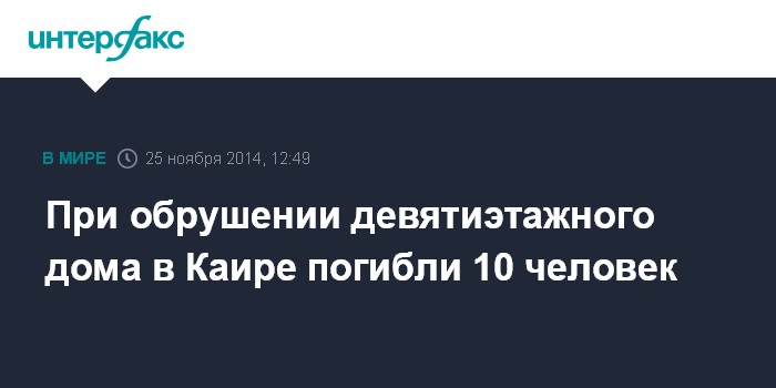 Москва. 25 ноября. INTERFAX.RU - Не менее десяти человек погибли в ночь на вторник в результате обрушения девятиэтажного здания в египетском Каире, сообщает межарабский телеканал Al Arabiya.