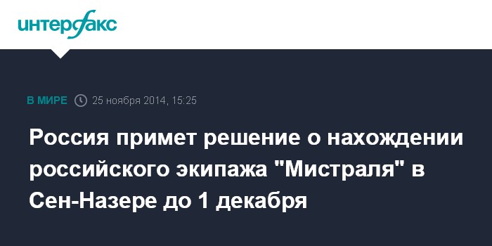 Москва. 25 ноября. INTERFAX.RU - Решение о целесообразности нахождения российского экипажа десантного вертолетоносного корабля-дока "Владивосток" типа "Мистраль" в Сен-Назере будет принято до 1 декабря, после чего моряки могут вернуться в Кронштадт, сообщил "Интерфаксу" во вторник военно-дипломатический источник.