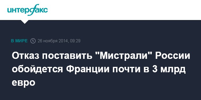 Москва. 26 ноября. INTERFAX.RU - Франции предстоит заплатить РФ около 3 млрд евро в случае окончательного отказа поставить Москве два вертолетоносца "Мистраль", пишет в среду газета Le Parisien.