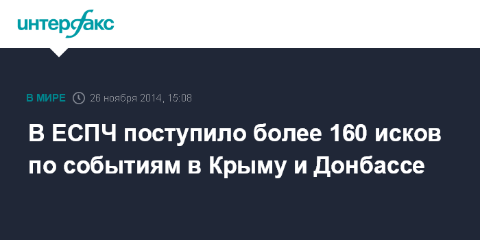 Москва. 26 ноября. INTERFAX.RU - В Европейском суде по правам человека (ЕСПЧ) на данный момент находятся свыше 160 исков граждан, связанных с событиями в Крыму на востоке Украины, говорится в опубликованном в среду коммюнике суда.