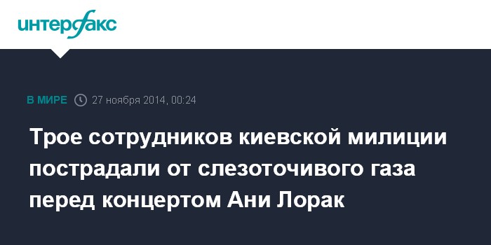 Москва. 27 ноября. INTERFAX.RU - Трое сотрудников милиции пострадали в Киеве во время обеспечения правопорядка возле дворца "Украина", где проходит концерт украинской певицы Ани Лорак.