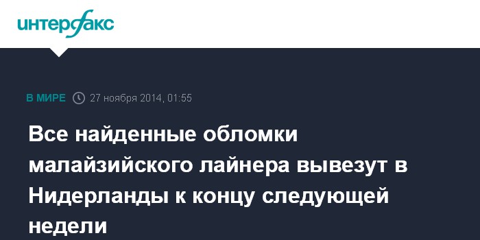 Москва. 27 ноября. INTERFAX.RU - Все найденные обломки малазийского авиалайнера "Боинг 777-200", потерпевшего крушение в Донецкой области в июле этого года, будут вывезены из Харькова в Нидерланды к концу следующей недели.