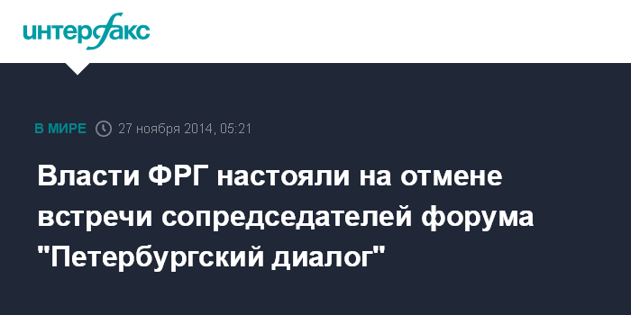 Москва. 27 ноября. INTERFAX.RU - Встреча сопредседателей форума гражданских обществ РФ и Германии "Петербургский диалог", запланированная на 1-2 декабря, отменена, сообщает "Коммерсант" в четверг.