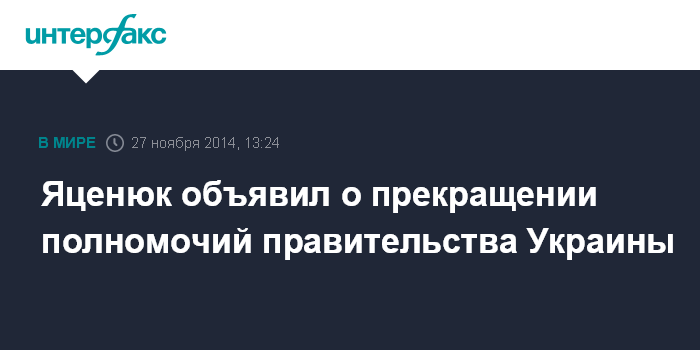 Москва. 27 ноября. INTERFAX.RU - Премьер-министр Украины Арсений Яценюк в четверг в парламенте объявил о прекращении полномочий кабинета министров в связи с началом работы Верховной рады нового созыва.