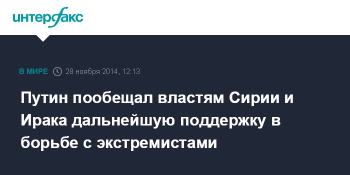 Москва. 28 ноября. INTERFAX.RU - Россия продолжит оказывать властям Сирии, Ирака и других государств помощь в борьбе с экстремистами, заявил президент Владимир Путин.
