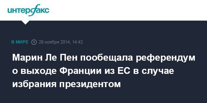 "Если меня выберут президентом Республики, я возьму на себя обязательство перед французами организовать через шесть месяцев референдум о выходе из Европейского союза", - сказала Ле Пен в интервью французской газете Le Figaro.