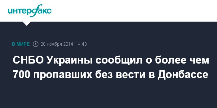 Москва. 28 ноября. INTERFAX.RU - По состоянию на 28 ноября, власти Украины не знают о судьбе более чем 700 человек, пропавших без вести в Донбассе, заявили в СНБО Украины.