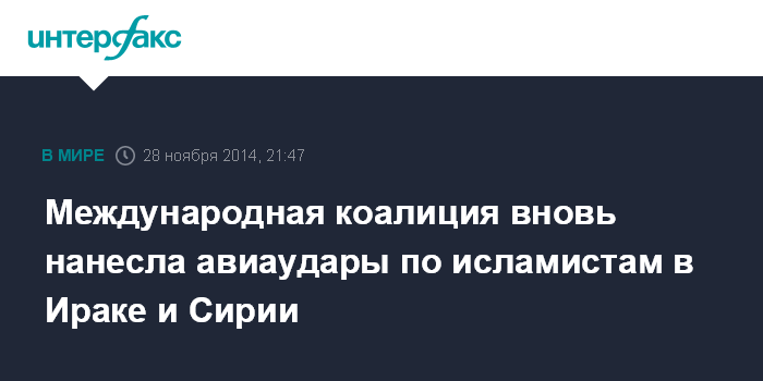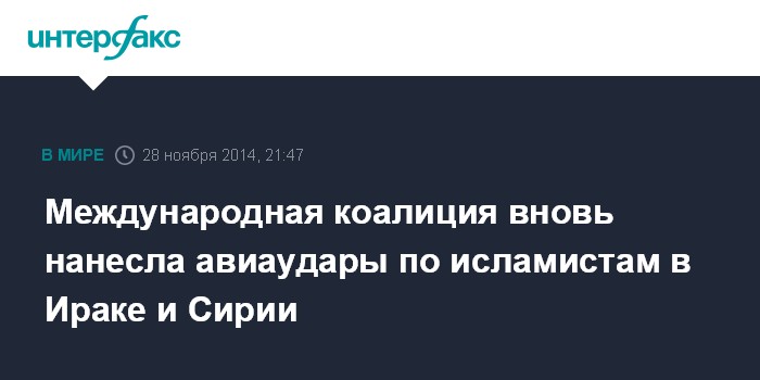 Москва. 28 ноября. INTERFAX.RU - Самолеты возглавляемой США международной коалиции за последние трое суток нанесли 15 авиаударов по позициям боевиков из радикальной группировки "Исламское государство" (ИГ), говорится в заявлении Центрального командования американских вооруженных сил.