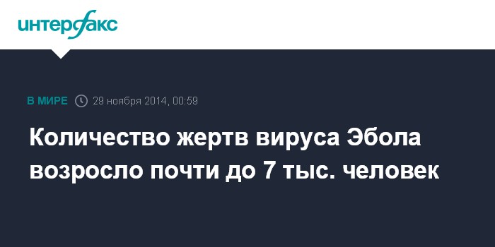 Москва. 28 ноября. INTERFAX.RU - Число умерших от вируса лихорадки Эбола увеличилось до 6928 человек. Об этом сообщает Всемирная организация здравоохранения (ВОЗ).