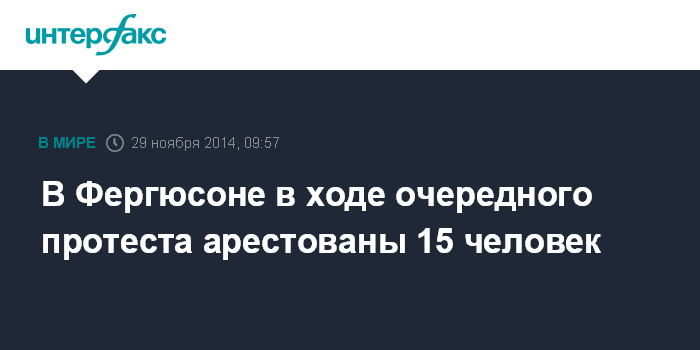 Москва. 29 ноября. INTERFAX.RU - Стражи порядка США арестовали накануне в городе Фергюсоне (пригород Сент-Луиса) 15 человек, протестовавших против убийства в августе полицейским темнокожего подростка, сообщило в микроблоге в твиттере полицейское управление Сент-Луиса.