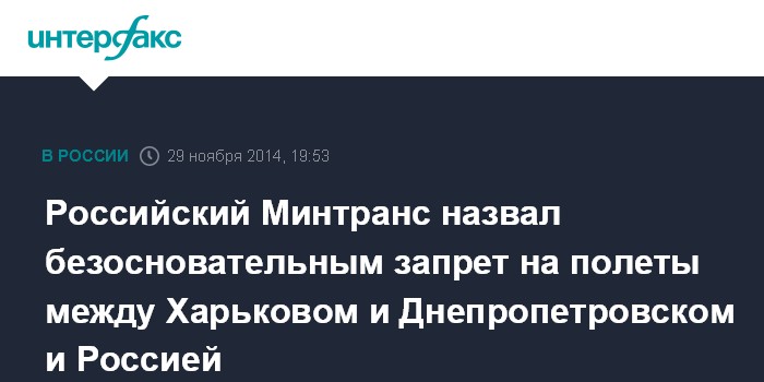 Москва. 29 ноября. INTERFAX.RU - Авиаслужба Украины безосновательно аннулировала ранее выданное разрешение на выполнение регулярных полетов российских и украинских авиаперевозчиков между Харьковом и Днепропетровском и Россией, считает российский Минтранс.