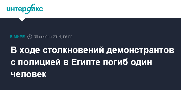 Москва. 30 ноября. INTERFAX.RU - Один человек погиб, более 10 получили травмы в результате столкновения демонстрантов с полицией в Египте, сообщили СМИ из Каира со ссылками на данные властей.