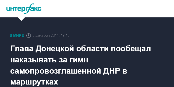 Москва. 2 декабря. INTERFAX.RU - Власти Донецкой области намерены привлечь пассажирских перевозчиков к ответственности за звучание в маршрутках гимна самопровозглашенной Донецкой народной республики, сообщил глава Донецкой облгосадминистрации Александр Кихтенко.