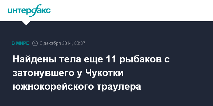 Москва. 3 декабря. INTERFAX.RU - Обнаружены тела 11 моряков с южнокорейского рыболовного траулера "Орионг-501", утонувшего в Беринговом море у берегов Чукотки. Четверо погибших - граждане Южной Кореи, один филиппинец, остальные - индонезийцы. Все тела подняты на борт российских судов. Об этом "Интерфаксу" сообщил начальник морского координационно-спасательного подцентра ФГУ "Администрация морского порта Петропавловск-Камчатский" Артур Рец.