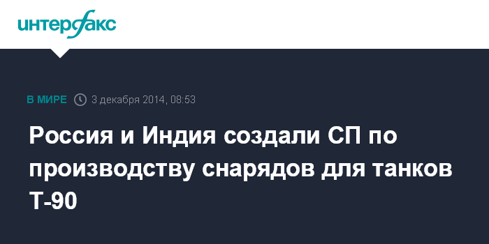 Москва. 3 декабря. INTERFAX.RU - Россия и Индия развернут совместное производство снарядов АМК-339 для 125-мм танковых орудий, которыми оснащены танки Т-90 Сухопутных войск Индии, сообщает министерство обороны Индии.