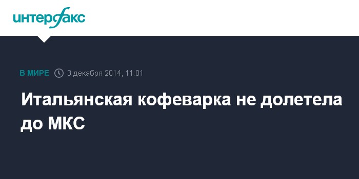 Москва. 3 декабря. INTERFAX.RU - Итальянская космическая кофе-машина ISSpresso не попала на борт космического корабля "Союз ТМА-15М", стартовавшего к Международной космической станции с Байконура 24 ноября, сообщил в среду "Интерфаксу" источник в российской ракетно-космической отрасли.