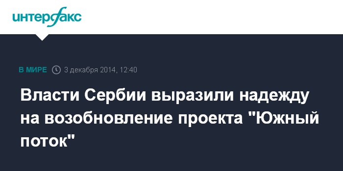 Москва. 3 декабря. INTERFAX.RU - Власти Сербии выразили надежду на то, что в течение декабря сторонам удастся придти к соглашению, которое позволит возобновить работу над газопроводом "Южный поток".