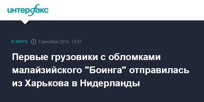 Москва. 3 декабря. INTERFAX.RU - Первые четыре грузовика с обломками малайзийского авиалайнера "Боинг 777-200" выехали из Харькова в Нидерланды, сообщает пресс-служба Харьковской облгосадминистрации.