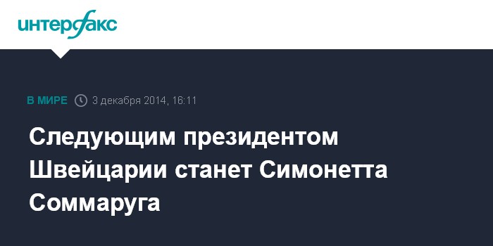 Москва. 3 декабря. INTERFAX.RU - Парламент Швейцарии избрал президентом конфедерации на 2015 год Симонетту Соммаругу, занимающую пост главы департамента юстиции этой страны, сообщают в среду западные СМИ.