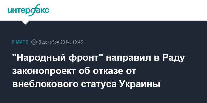 Москва. 3 декабря. INTERFAX.RU - В Верховную раду Украины поступил законопроект, предусматривающий отмену внеблокового статуса страны, сообщила в среду пресс-служба партии "Народный фронт".