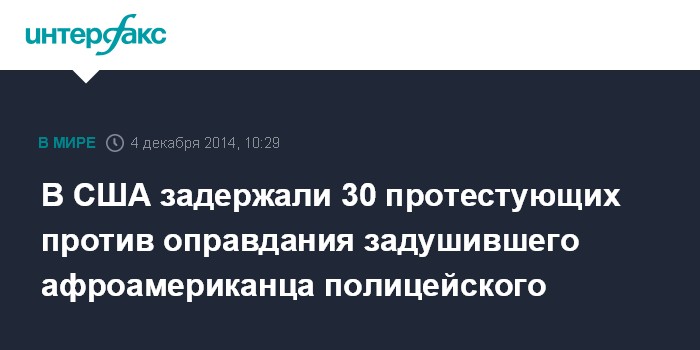 Москва. 4 декабря. INTERFAX.RU - Задержаны по меньшей мере 30 участников протестов, вспыхнувших накануне вечером в Нью-Йорке после оправдания присяжными белокожего полицейского Дэниэла Пантело, который в июле при задержании задушил афроамериканца Эрика Гарнера.