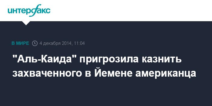 Москва. 4 декабря. INTERFAX.RU - Ячейка террористической группировки "Аль-Каида" в Йемене пригрозила расправой над американцем Люком Сомерсом, взятым в плен в Сане в сентябре 2013 года, сообщает Washington Post.