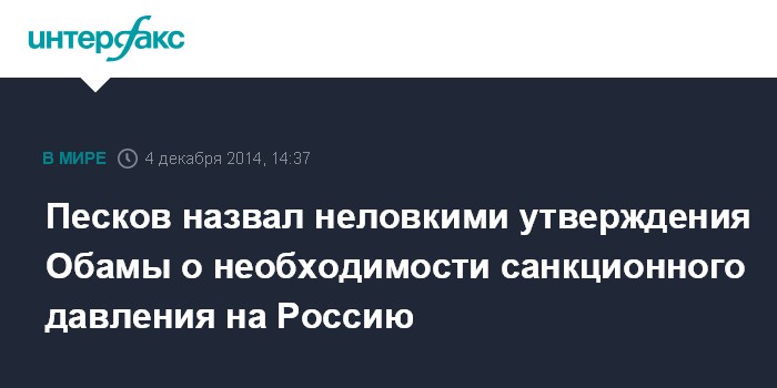 Москва. 4 декабря. INTERFAX.RU - Пресс-секретарь президента РФ Дмитрий Песков заявил, что у Москвы вызывают сожаление недавние высказывания президента США Барака Обамы о необходимости продолжения санкционного давления на Россию.