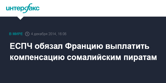 Москва. 4 декабря. INTERFAX.RU - Европейский суд по правам человека в четверг постановил взыскать с французских властей сумму в размере нескольких тысяч евро по двум делам о нарушении прав сомалийских пиратов.