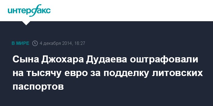 Москва. 4 декабря. INTERFAX.RU - Каунасский участковый суд в четверг оштрафовал сына бывшего президента Чечни Джохара Дудаева Деги на почти 940 евро (3250 литов) за подделку документов, сообщает BNS.