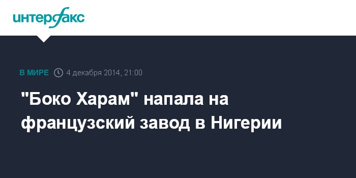 Москва. 4 декабря. INTERFAX.RU - Боевики исламистской группировки "Боко Харам" совершили нападение на северо-востоке Нигерии на цементный завод, принадлежащий французской компании Lafarge SA, сообщают в четверг западные СМИ.
