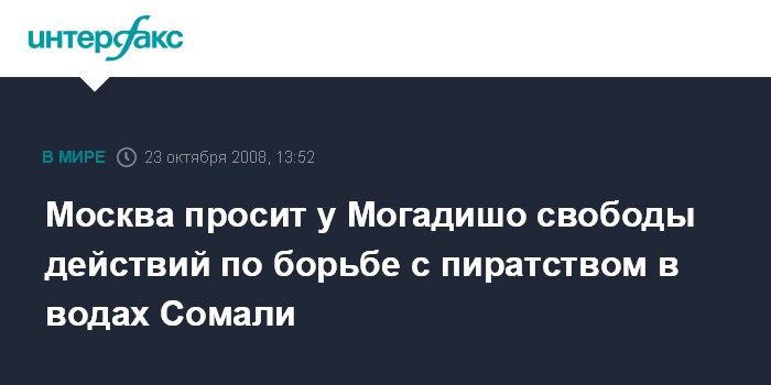 Москва. 23 октября. INTERFAX.RU - Россия запросила у правительства Сомали разрешение на борьбу с пиратами в территориальных водах этого государства, сообщил МИД РФ.