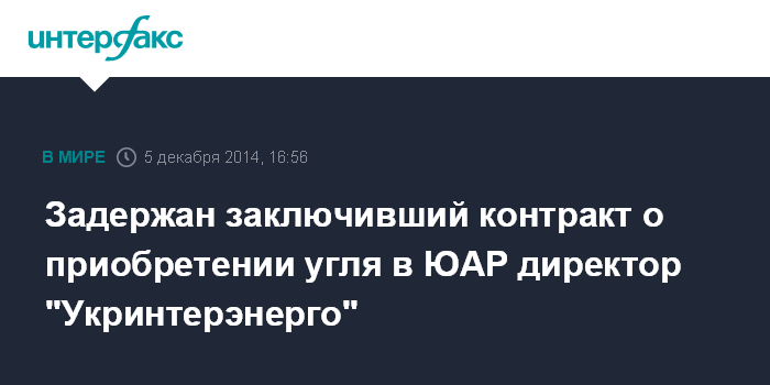 Москва. 5 декабря. INTERFAX.RU - Директор государственного украинского предприятия "Укринтерэнерго", заключивший контракт на приобретение в ЮАР угля сомнительного качества, задержан в рамках расследования уголовного дела о растрате средств в особо крупных размерах.