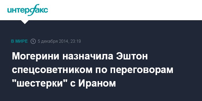 Москва. 5 декабря. INTERFAX.RU - Верховный представитель ЕС по иностранным делам и политике безопасности Федерика Могерини приняла решение назначить Кэтрин Эштон своим специальным советником по ядерным переговорам с Ираном на период их продолжения после 24 ноября.