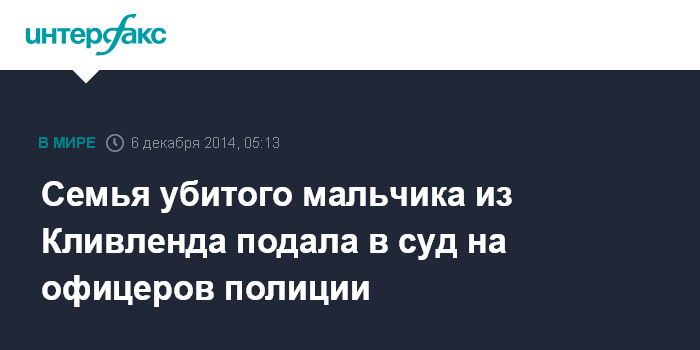 Москва. 6 декабря. INTERFAX.RU - Семья 12-летнего Тамира Райса из американского Кливленда подала иск против городской администрации и офицеров полиции, один из которых дважды выстрелил в мальчика, сообщило агентство Associated Press.