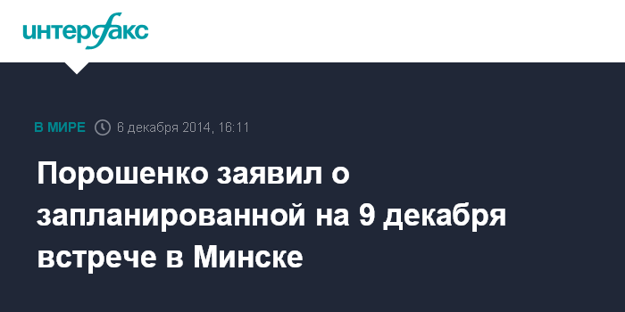 Москва. 6 декабря. INTERFAX.RU - Очередная встреча контактной группы по ситуации в Донбассе запланирована в Минске 9 декабря, заявляет президент Украины Петр Порошенко. "Достигнута пока предварительна договоренность, что встреча в Минске состоится 9 декабря", - сказал он в субботу на аэродроме в Чугуеве (Харьковская область - ИФ) в субботу.