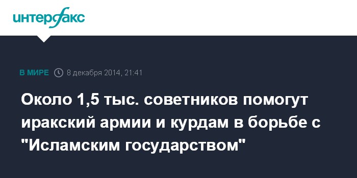 Москва. 8 декабря. INTERFAX.RU - Союзники США по коалиции, противостоящей боевикам "Исламского государства", намерены направить на помощь иракской армии и курдским формированиям 1,5 тыс. советников, сообщил в понедельник американский генерал Джеймс Терри.
