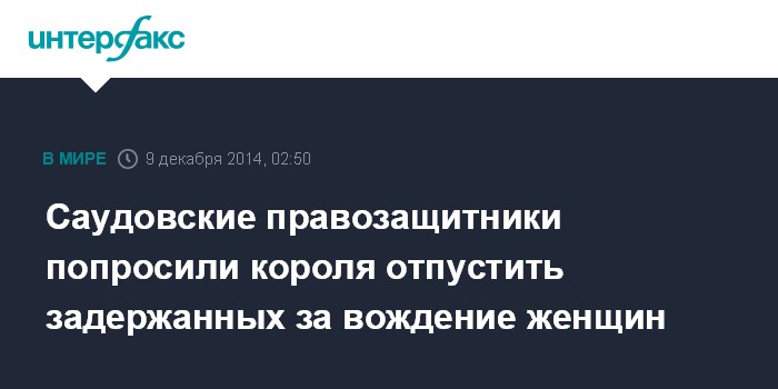 Москва. 9 декабря. INTERFAX.RU - Саудовские активисты в понедельник обратились к королю своей страны с просьбой освободить двух женщин, задержанных на прошлой неделе во время вождения автомобиля без соблюдения надлежащих условий, сообщила The New York Times.