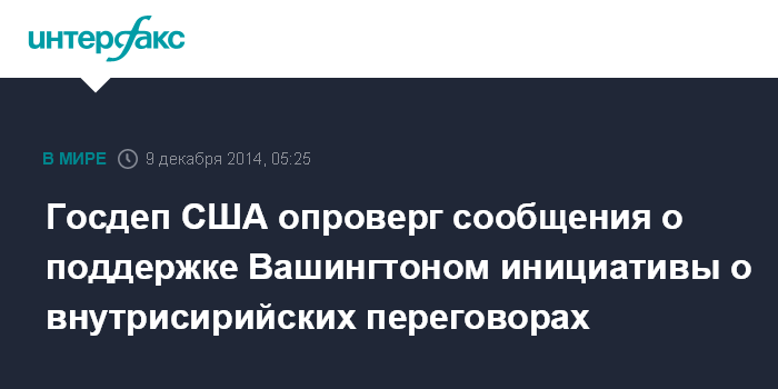 Москва. 9 декабря. INTERFAX.RU - Представитель госдепартамента США Джен Псаки опровергла ранее появившиеся сообщения СМИ о поддержке Соединенными Штатами российской инициативы о проведении в Москве встречи представителей сирийского режима и умеренной оппозиции.