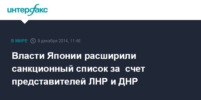 Москва. 9 декабря. INTERFAX.RU - Кабинет министров Японии расширил санкционный список еще на 26 физических лиц и 14 организаций, причастных к проведению выборов 2 ноября в самопровозглашенных ДНР и ЛНР на востоке Украины, сообщили во вторник в японском правительстве.