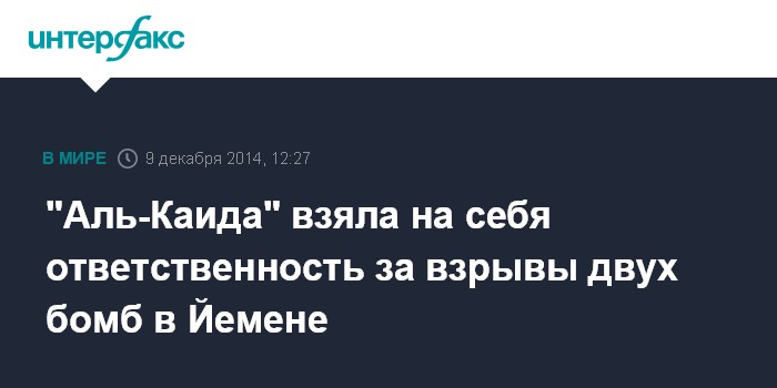 Москва. 9 декабря. INTERFAX.RU - Группировка "Ансар аш-Шариа", считающаяся йеменской ячейкой "Аль-Каиды", взяла на себя ответственность за взрывы на юго-востоке Йемена, передает во вторник пакистанский телеканал Geo TV.