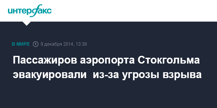 Москва. 9 декабря. INTERFAX.RU - Пассажиры эвакуированы из международного терминала стокгольмского аэропорта Арланда из-за угрозы взрыва, передает норвежский телеканал NRK.