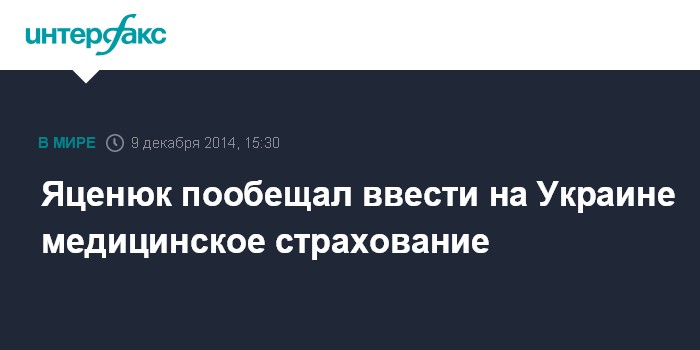 Москва. 9 декабря. INTERFAX.RU - На Украине будет введено медицинское страхование, которое позволит эффективно расходовать бюджетные средства, выделяемые на систему здравоохранение, сказал премьер-министр Украины Арсений Яценюк.