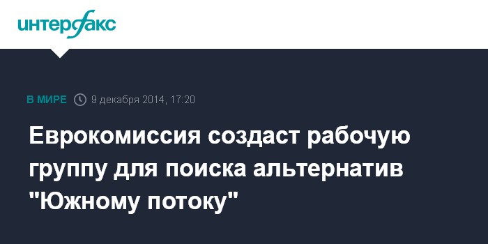 Москва. 9 декабря. INTERFAX.RU - Европейская комиссии создает специальную рабочую группу с представителями стран ЕС, по которым должен был пройти "Южный поток", для обсуждения последствий отказа России от строительства газопровода, заявил во вторник заместитель председателя ЕК Марош Шефчович.